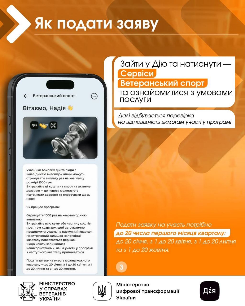 Розпочинається державна програма, за якою учасники бойових дій та ветерани з інвалідністю внаслідок війни зможуть щоквартально отримувати по 1 500 грн для оплати спортивних занять.