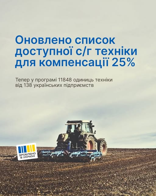 Міністерство економіки України внесло зміни до переліку вітчизняної техніки та обладнання для агропромислового комплексу, 25% вартості яких (без ПДВ) компенсується державою. Тепер до програми входять 11 848 одиниць техніки від 138 українських підприємств.