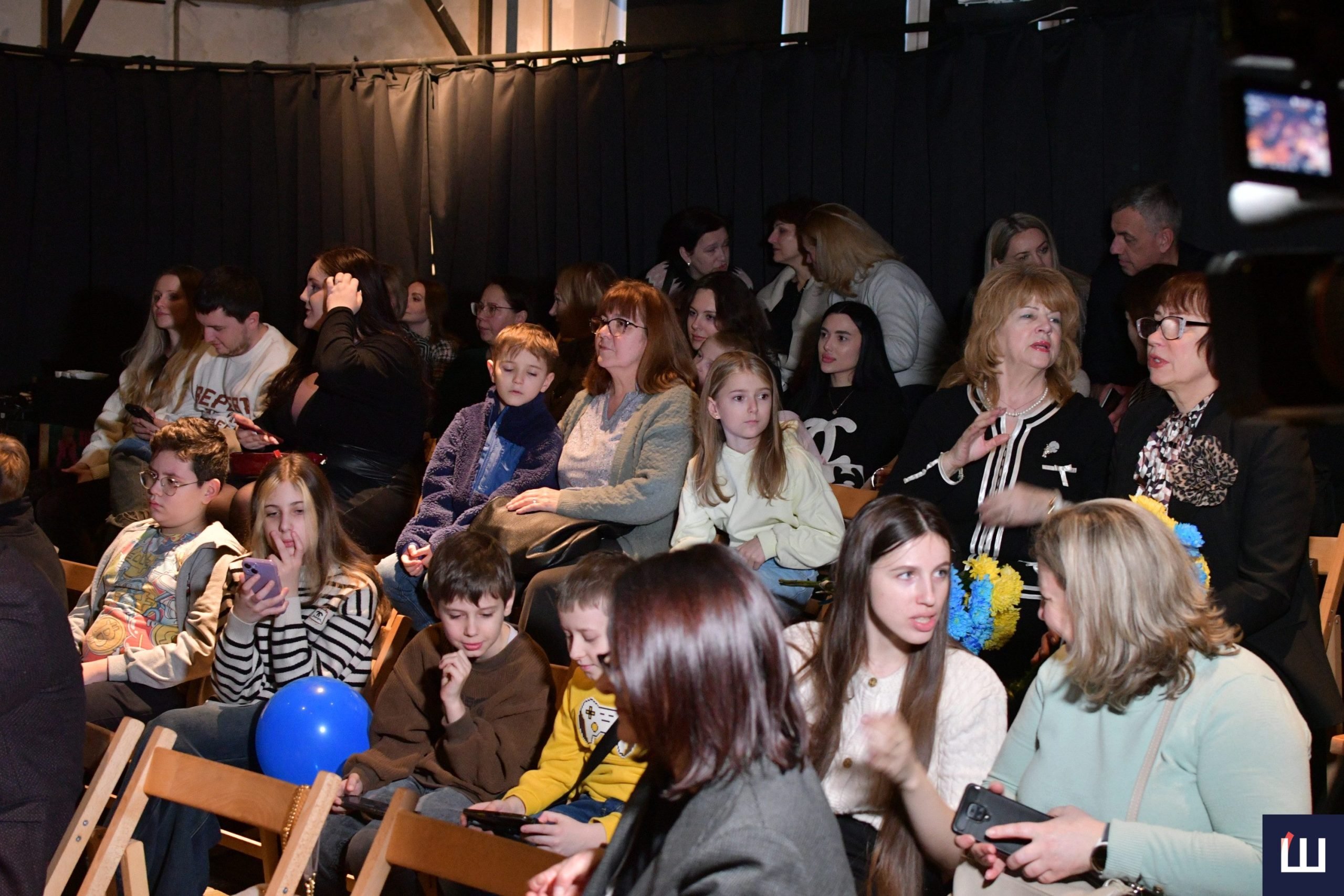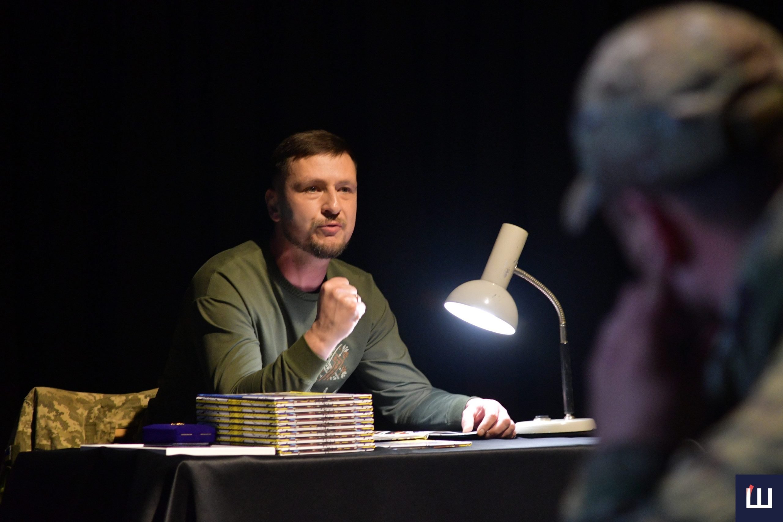 Саму ж презентацію провели теж у форматі уроку, де вчителем став актор драмтеатру Олексій Надкерничний. Він донедавна також був військовим.