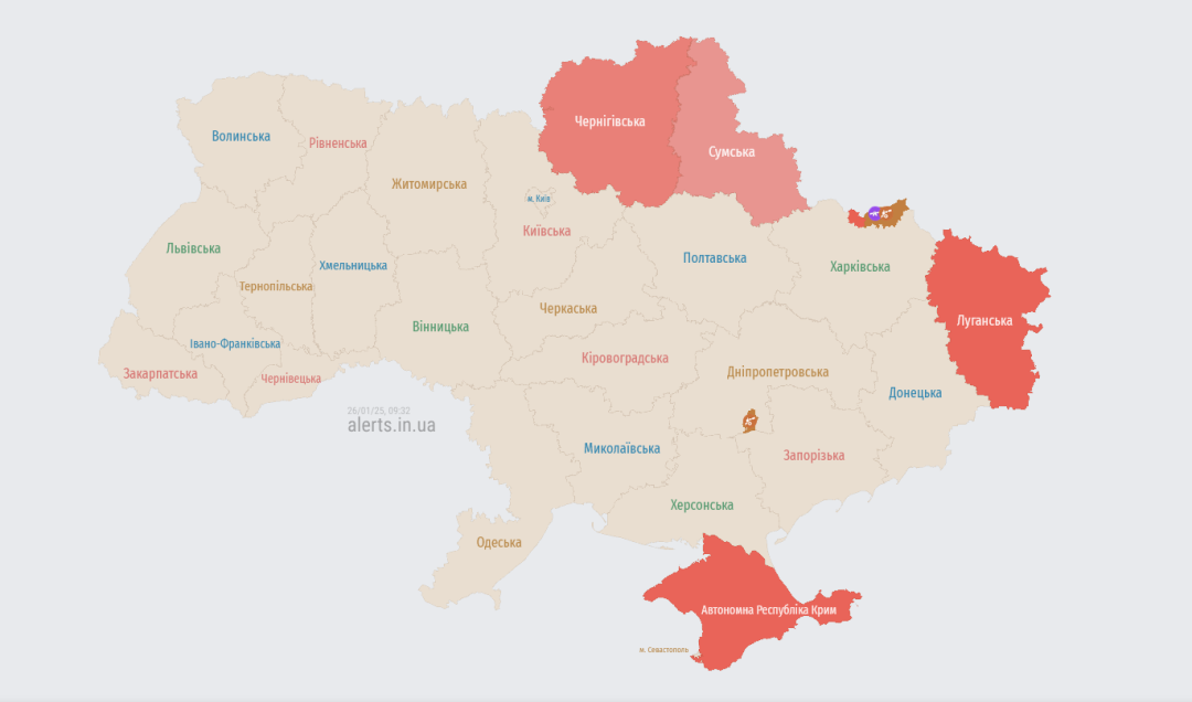 Наразі повітряна тривога олошена у Сумській та Чернігівській областях.
