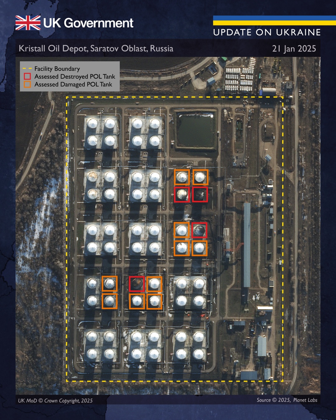 «8 січня українські безпілотники завдали удару по нафтобазі «Крістал» у Росії, що за 8 км від авіабази «Енгельс-2». Атака спричинила масштабні пожежі в зоні зберігання нафти та мастильних матеріалів. На їхнє гасіння знадобилося декілька днів. У ніч проти 14 січня також було завдано повторного удару по нафтобазі «Крістал», що призвело до пожежі та подальшого пошкодження інфраструктури об’єкта. Аналіз зображень від 21 січня показує чотири знищених резервуари і десять пошкоджених резервуарів», – заявили у відомстві.