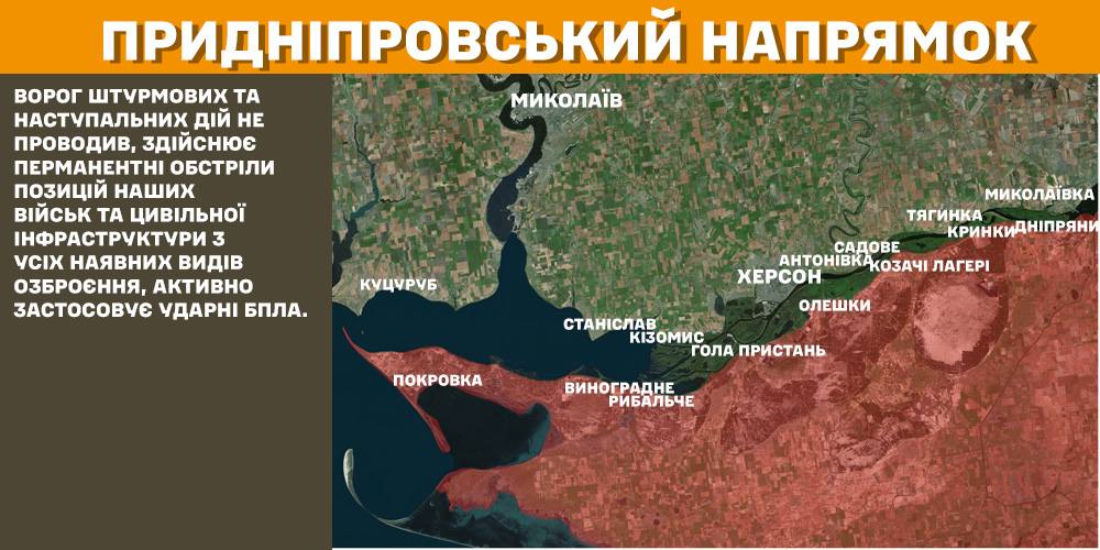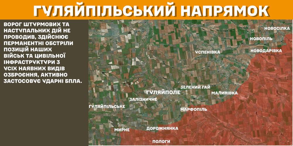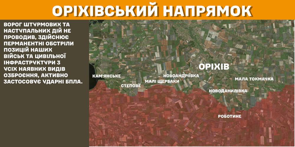 На Гуляйпільському, Оріхівському та Придніпровському напрямках ворог штурмових та наступальних дій не проводив, здійснює перманентні обстріли позицій українських військ та цивільної інфраструктури з усіх наявних видів озброєння, активно застосовує ударні БПЛА.
