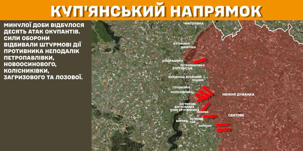На Куп’янському напрямку минулої доби відбулося десять російських атак. Сили оборони відбивали штурмові дії ворога неподалік Петропавлівки, Новоосинового, Колісниківки, Загризового та Лозової.