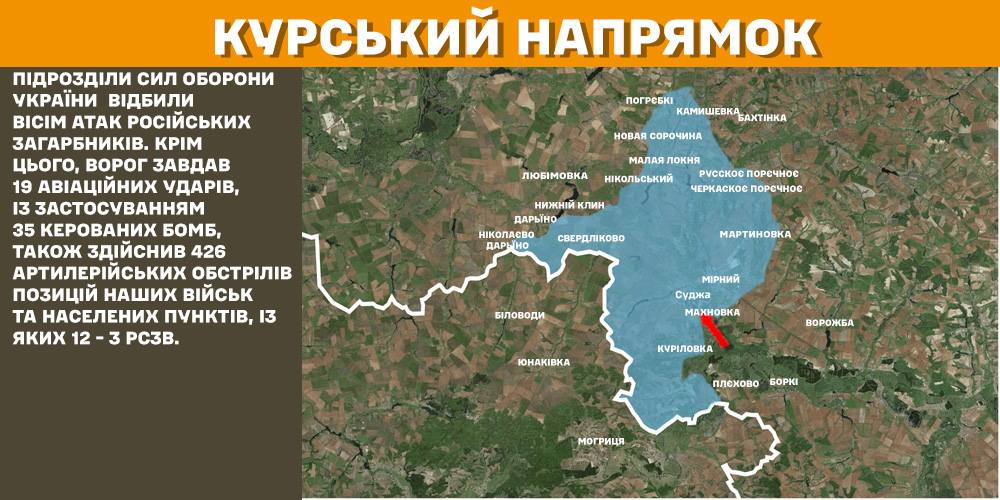 На Курському напрямку підрозділи Сил оборони за минулу добу відбили вісім атак російських загарбників. Крім того, ворог завдав 19 авіаційних ударів, із застосуванням 35 керованих бомб, також здійснив 426 артилерійських обстрілів позицій українських військ та населених пунктів, із яких 12 – з РСЗВ.