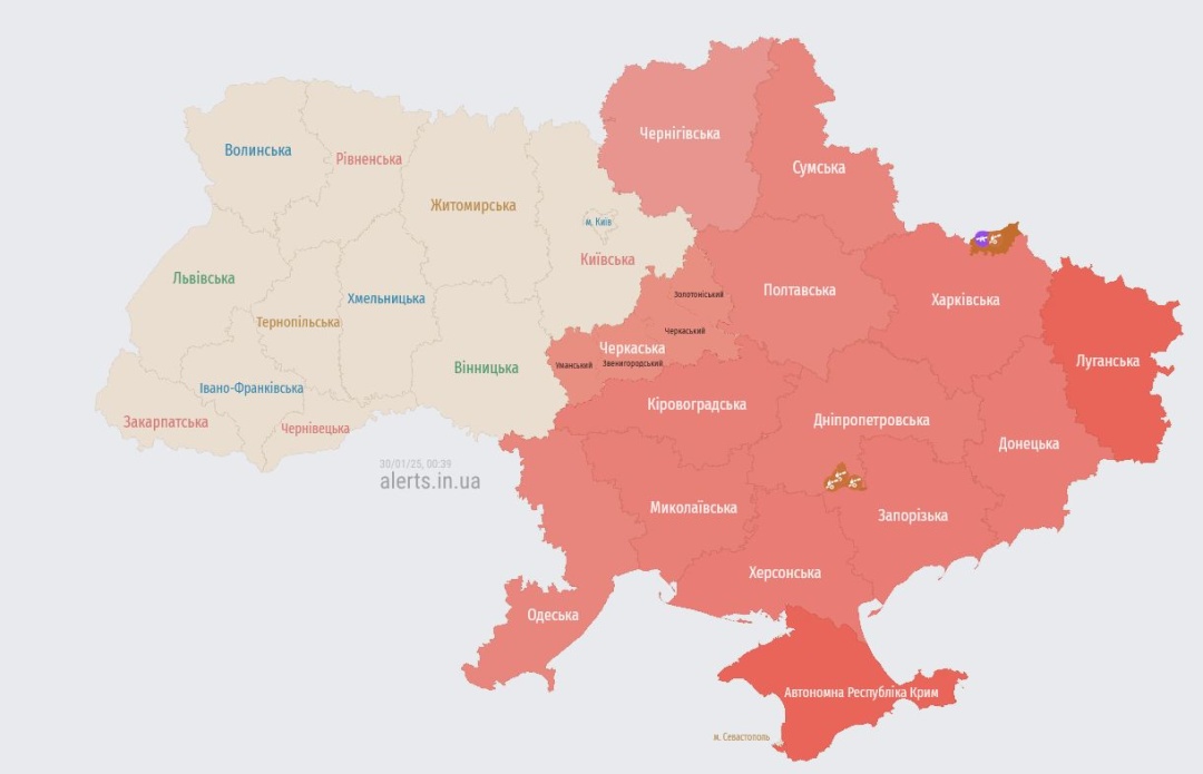Актуальна карта повітряних тривога станом на 00:39 / Джерело: https://alerts.in.ua/