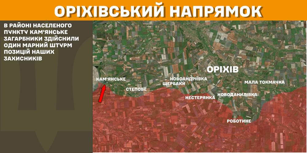 На Оріхівському напрямку в районі населеного пункту Кам’янське загарбники здійснили один марний штурм позицій наших захисників.