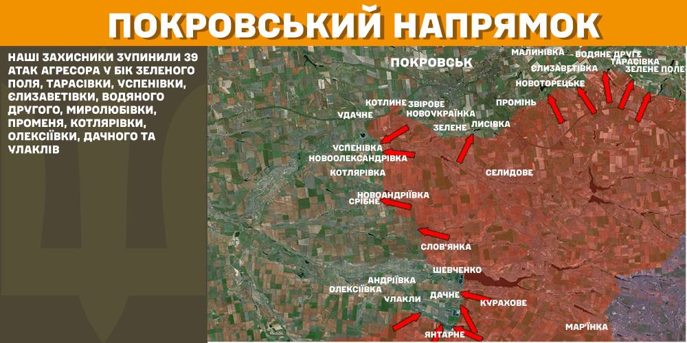 На Покровському напрямку наші захисники зупинили 39 атак агресора у бік Зеленого Поля, Тарасівки, Успенівки, Єлизаветівки, Водяного Другого, Миролюбівки, Променя, Котлярівки, Олексіївки, Дачного та Улаклів.