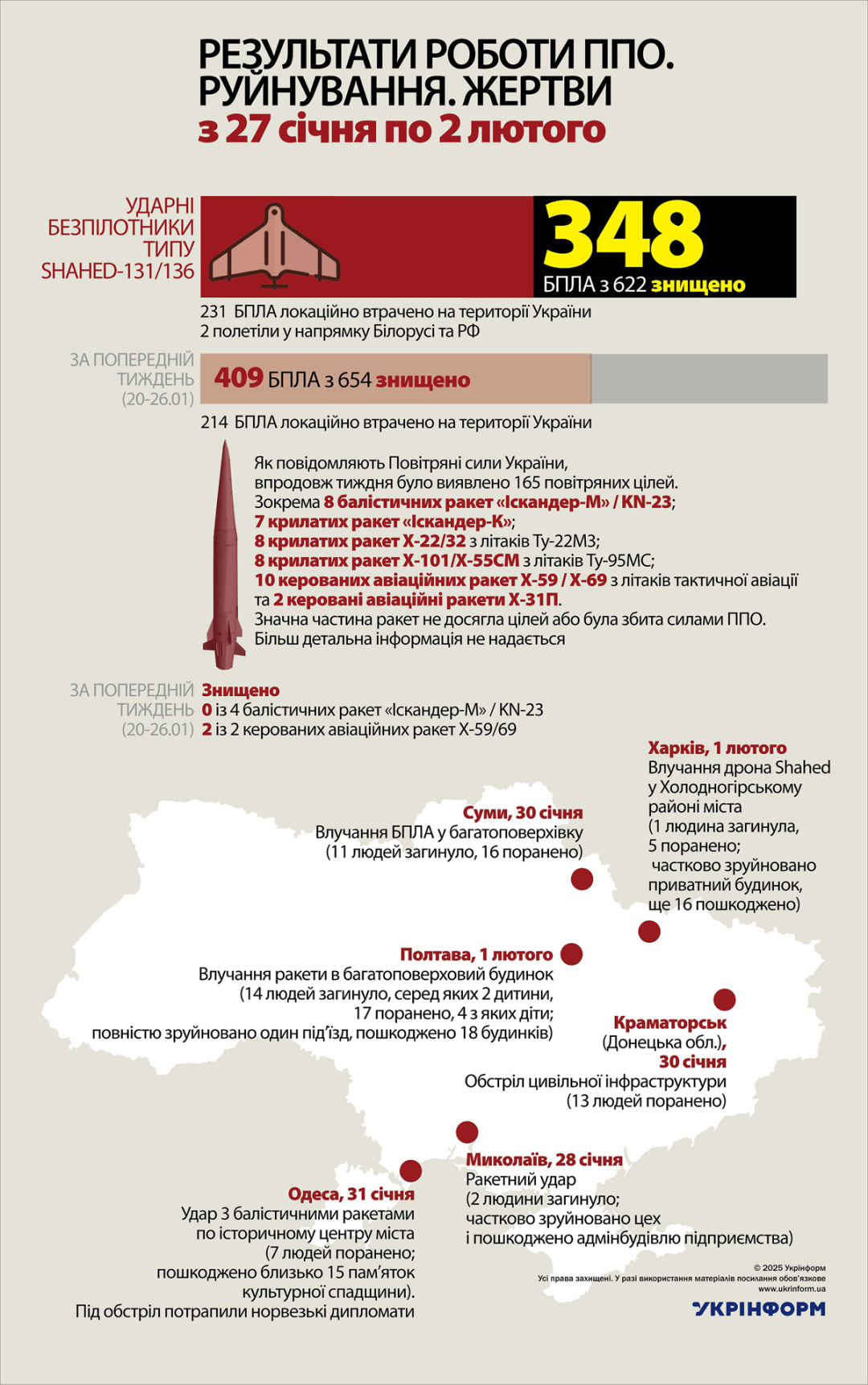 Внаслідок обстрілів російськими окупантами з 27.01 по 02.02 Донецької, Херсонської, Дніпропетровської,  Запорізької та Харківської областей 14 людей загинули, 94 отримали поранення.