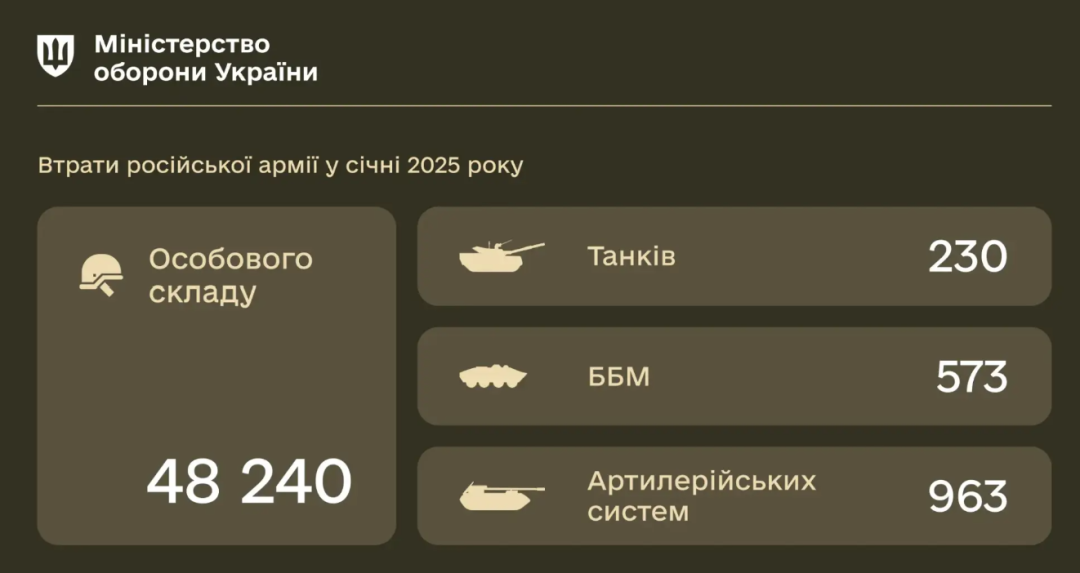 Безповоротні й санітарні втрати особового складу російських військ у січні сягнули 48 тисяч 240 осіб, що умовно дорівнює чисельності понад трьох мотострілецьких дивізій.