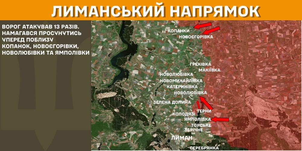 На Лиманському напрямку ворог атакував 13 разів, намагався просунутись поблизу Копанок, Новоєгорівки, Новолюбівки та Ямполівки.