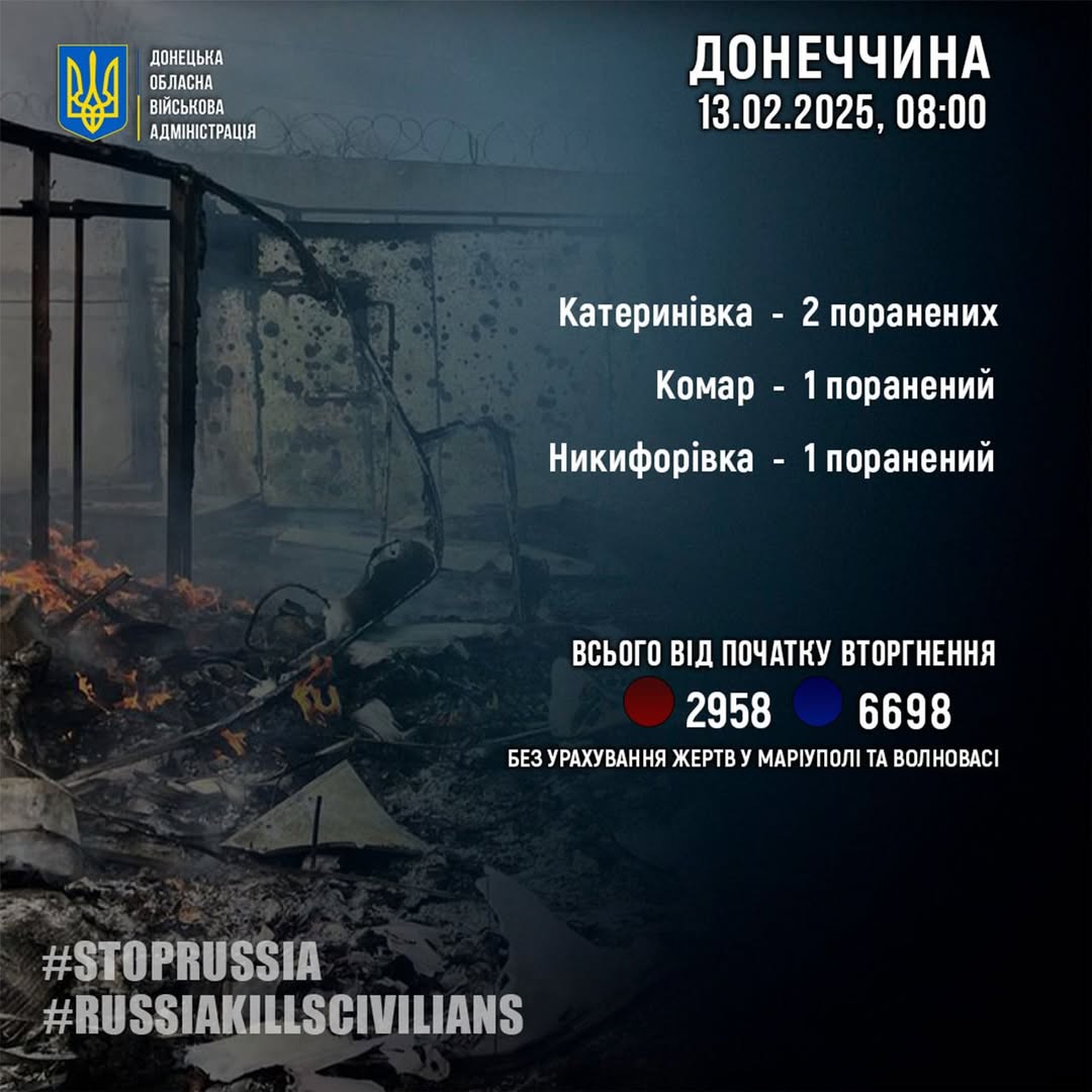 "За 12 лютого росіяни поранили 4 жителів Донеччини: 2 у Катеринівці, 1 у Комарі і Никифорівці", – зазначив він.