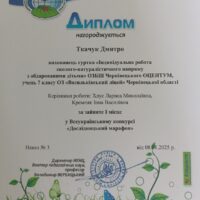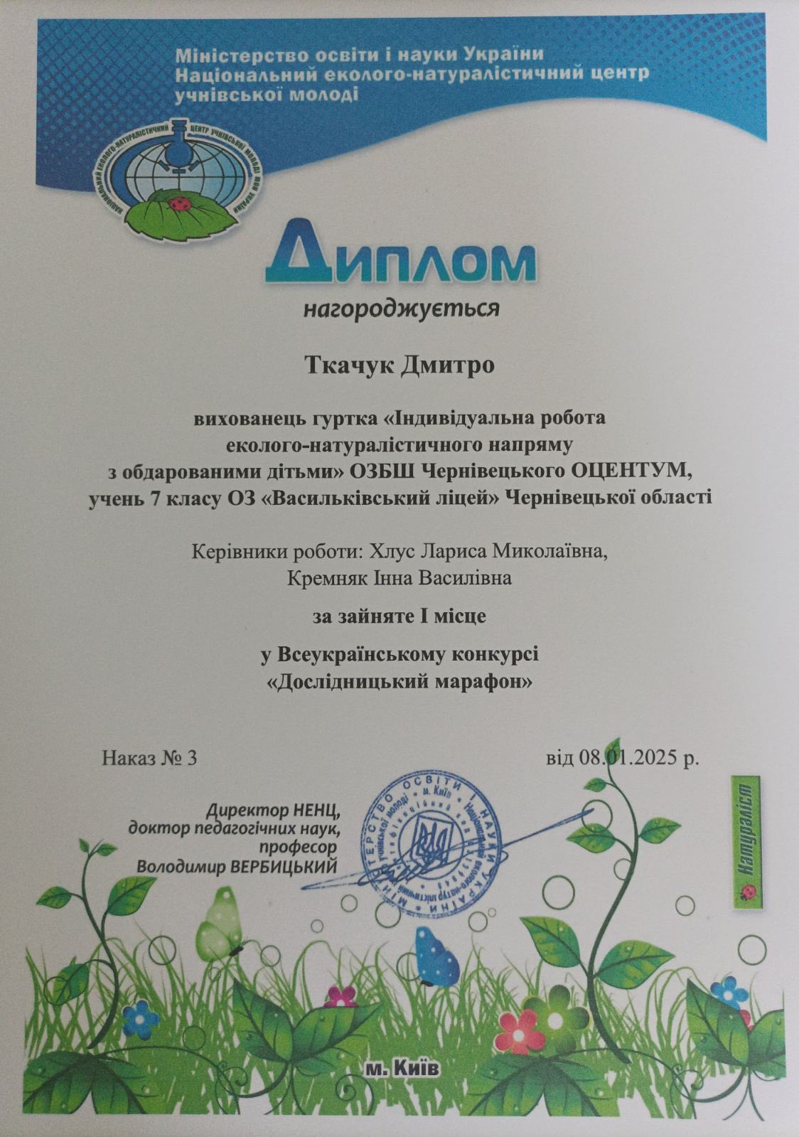 І місце – Дмитро Ткачук, учень ОЗ «Василівський ліцей», вихованець гуртка «Індивідуальна робота еколого-натуралістичного напряму з обдарованими дітьми» ОЗБШ Чернівецького ОЦЕНТУМ.