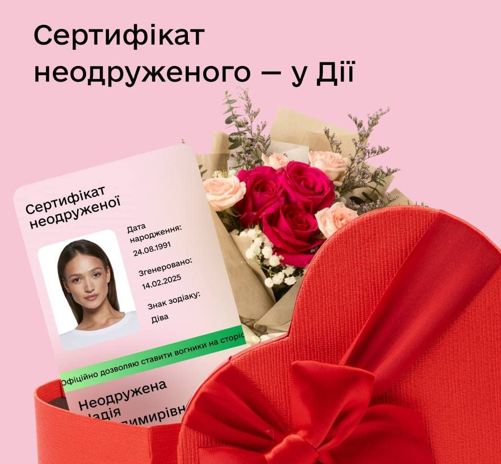 Дія до Дня усіх закоханих презентувала сертифікат неодруженого та неодруженої. Документ не має ніякої юридичної сили, але засвідчує, що «серце та безіменний палець користувача вільні».