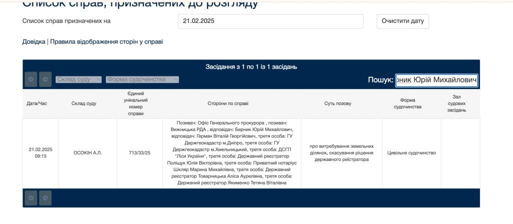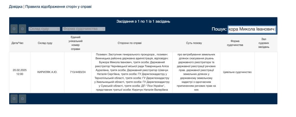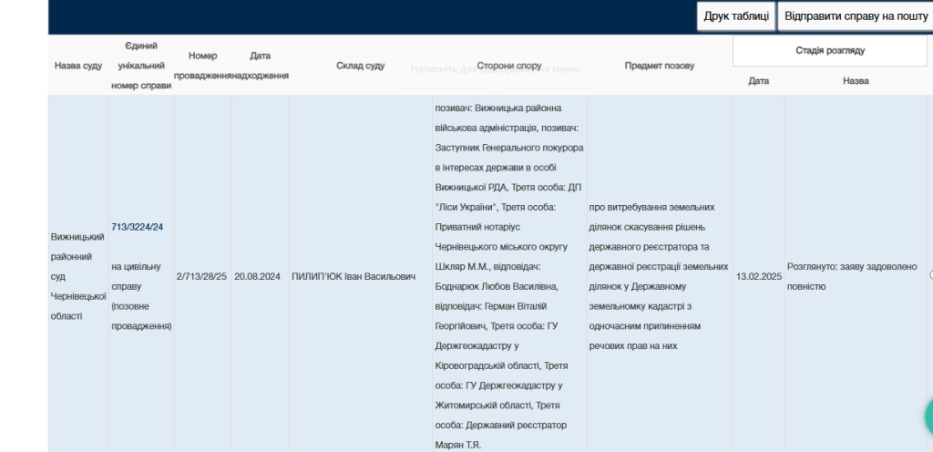 Тепер про особу, яка стала власницею земельної ділянки площею два гектари. На сайті «Судова влада України» є інформація про те, що відповідачкою у справі 713/3224/24 є громадянка Боднарюк Любов Василівна. Вона є тезкою нинішнього голови ОТГ Сергія Боднарюка. У Миговому говорять, що це — мама голови ОТГ.
