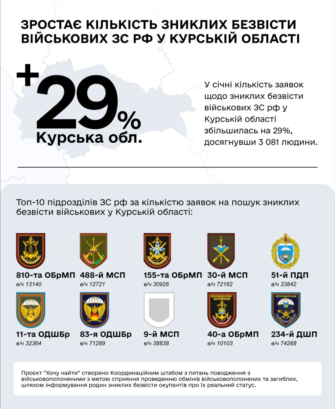 До «топ 10» підрозділів Збройних сил РФ за кількістю звернень щодо зниклих безвісти військовослужбовців у Курській області увійшли: 810-та бригада морської піхоти, в/ч 13140; 488-й мотострілецький полк, в/ч 12721; 155-та бригада морської піхоти, в/ч 30926; 30-й мотострілецький полк, в/ч 72162; 51-й парашутно-десантний полк, в/ч 33842; 11-ша десантно-штурмова бригада, в/ч 32364; 83-я десантно-штурмова бригада, в/ч 71289; 9-й мотострілецький полк, в/ч 38838; 40-ша бригада морської піхоти, в/ч 10103; 234-й десантно-штурмовий полк, в/ч 74268.