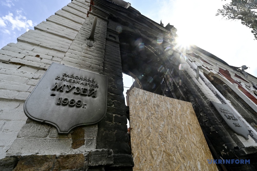 Згоріла внаслідок російського обстрілу 24 серпня будівля Гуляйпільського районного краєзнавчого музею у прифронтовому місті Гуляйполе, Пологівський район, Запорізька область, 28 серпня 2024 року.