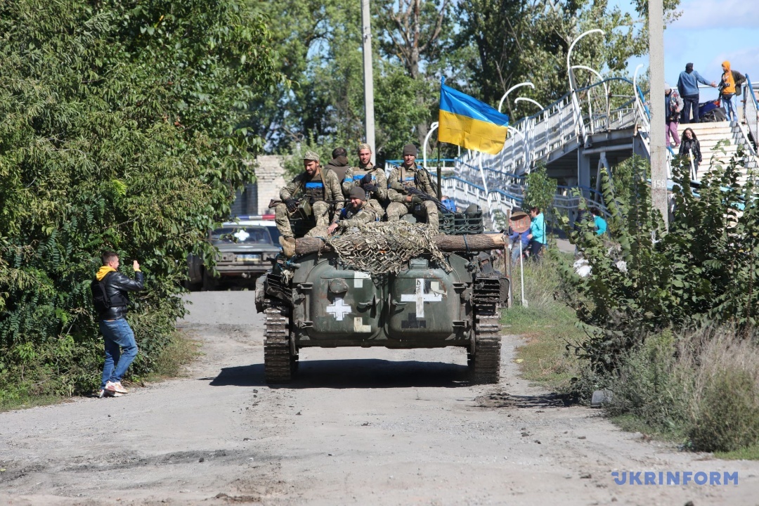 Військові на бойовій машині піхоти (БМП) їдуть дорогою деокупованого міста, Ізюм, Харківська область, 19 вересня 2022 року.
