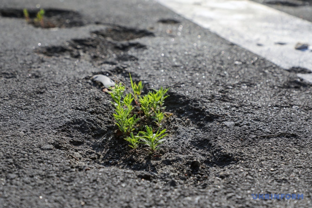 Рослина, що проросла крізь асфальт, на місці падіння уламків російської ракети, Краматорськ, Донецька область, 21 червня 2023 року.
