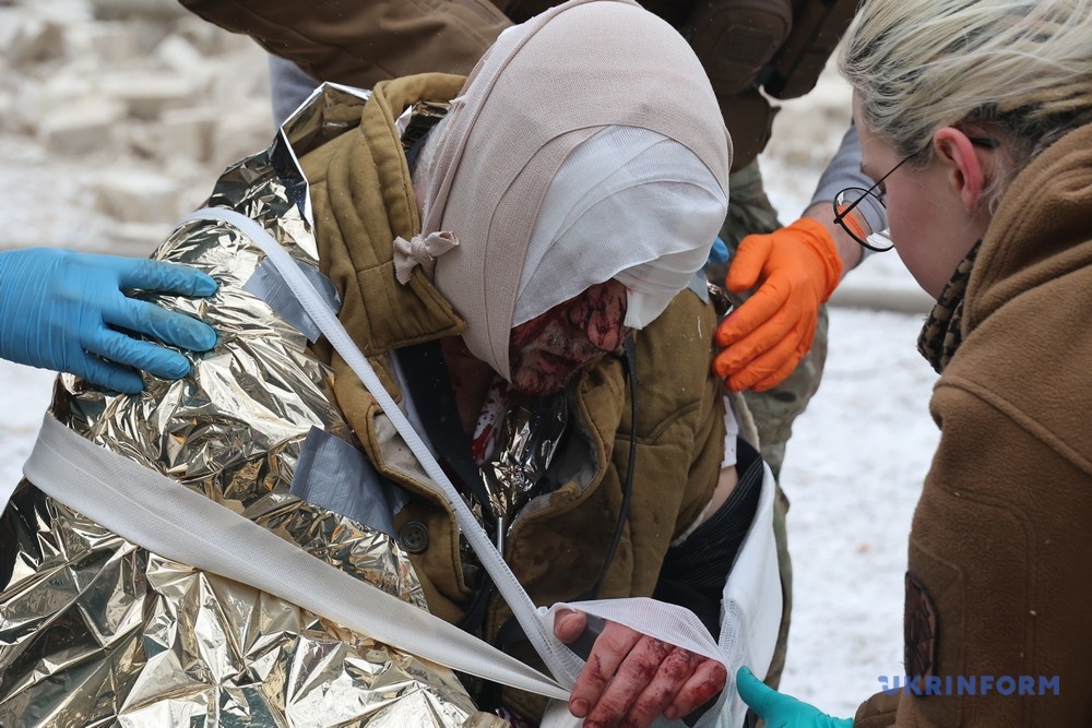 Першу домедичну допомогу надають постраждалому внаслідок ракетного удару військ РФ по Харкову, 23 січня 2024 року.