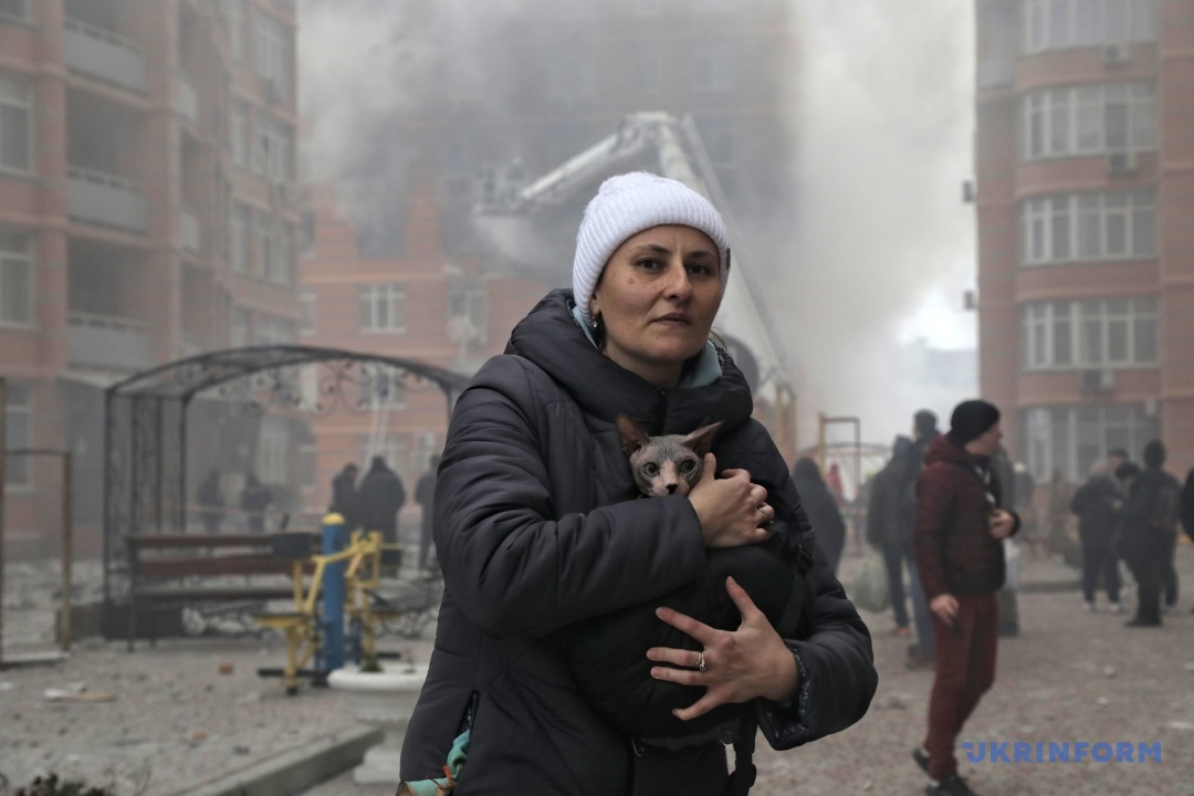 Жінка з кішкою на руках на місці ліквідації ракетного обстрілу російськими військами житлового комплексу, Одеса, 29 грудня 2023 року.