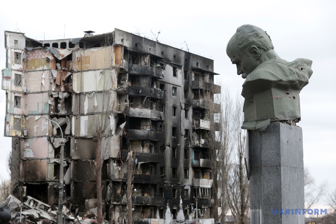 Пам’ятник Тарасу Шевченку, який розстріляли російські військові, на тлі зруйнованої житлової багатоповерхівки у звільненій від загарбників Бородянці, Київська область, 6 квітня 2022 року.