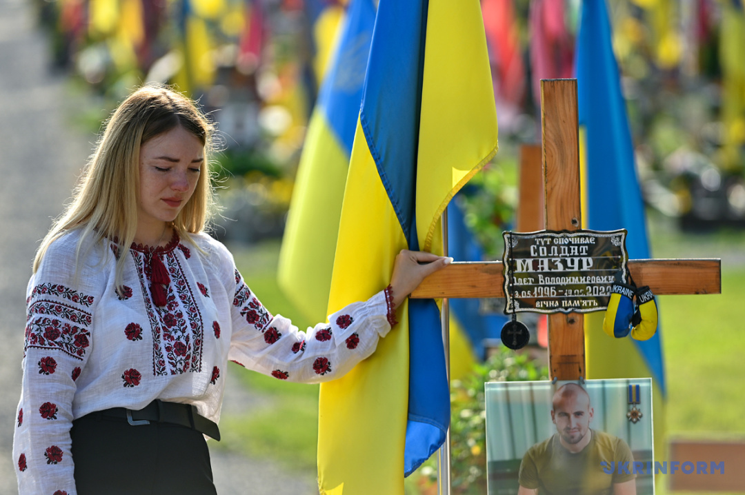 Дівчина біля могили під час вшанування пам’яті захисників України, які загинули на війні з Росією, на військовому цвинтарі у Львові, 24 серпня 2023 року.