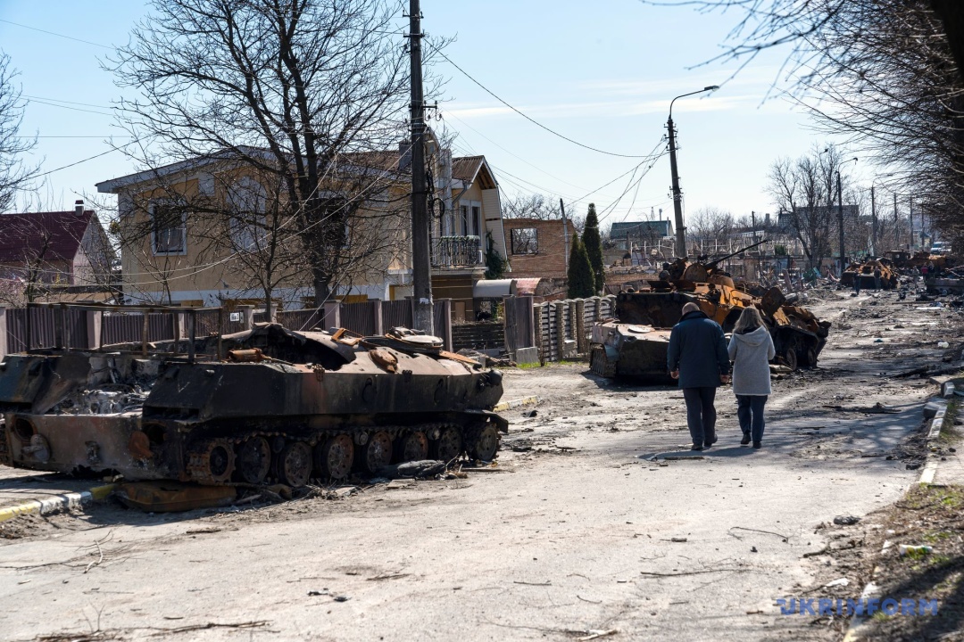 Знищена військова техніка біля пошкоджених і зруйнованих внаслідок російської агресії приватних будинків на одній з вулиць деокупованого міста Буча, Київська область, 7 квітня 2022 року.