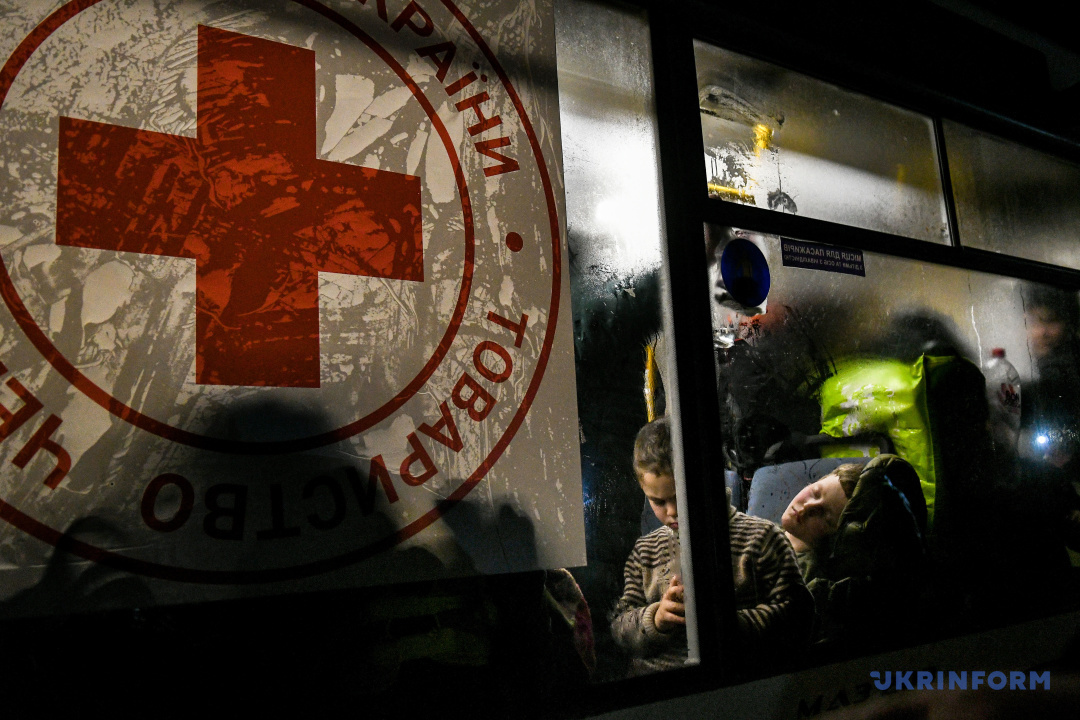 Діти-вимушені переселенці в автобусі, на якому вони евакуювалися з Маріуполя, Запоріжжя, 22 березня 2022 року.