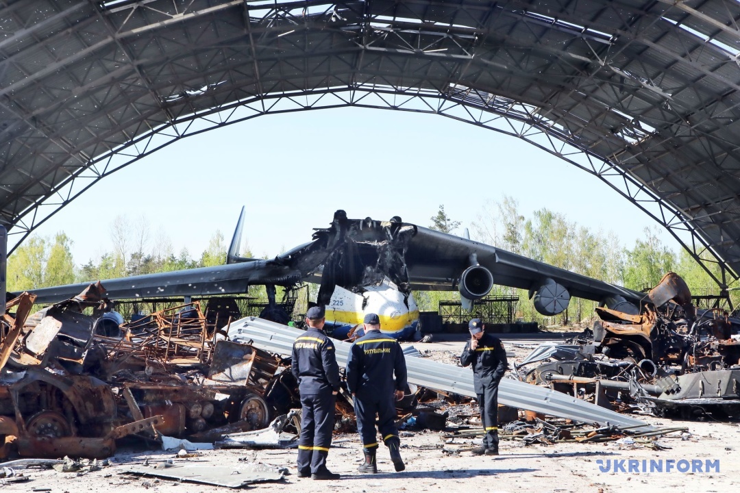 Рятувальники біля знищеного російськими військами найбільшого у світі літака АН-225 "Мрія" в ангарі аеропорту "Антонов", Гостомель, Київська область, 5 травня 2022 року.