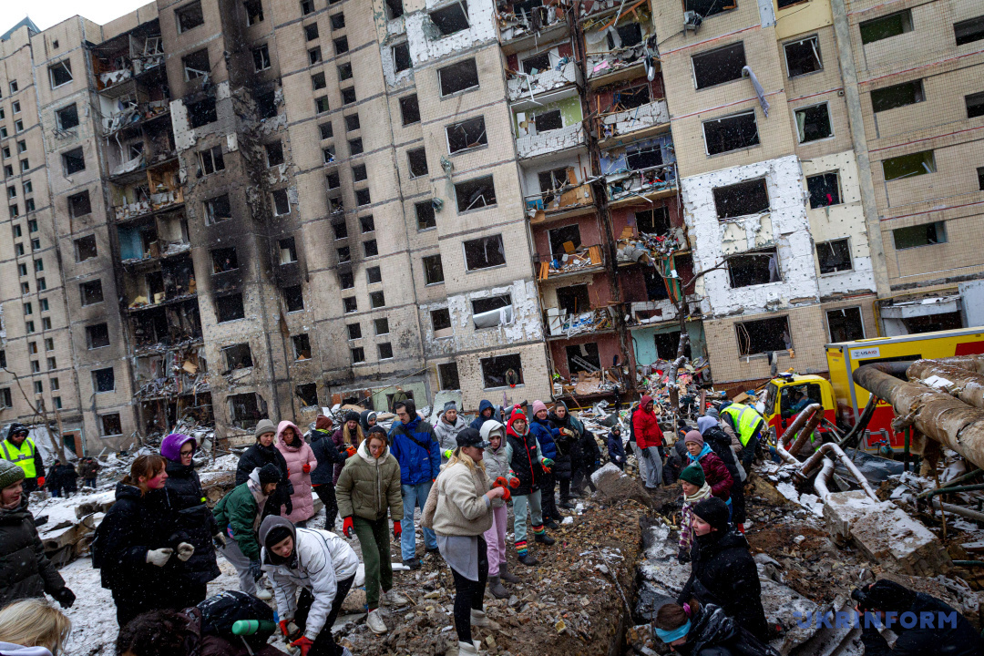Місцеві мешканці біля понівеченого житлового будинку під час ліквідації наслідків російського обстрілу в Солом’янському районі столиці, Київ, 3 січня 2024 року.