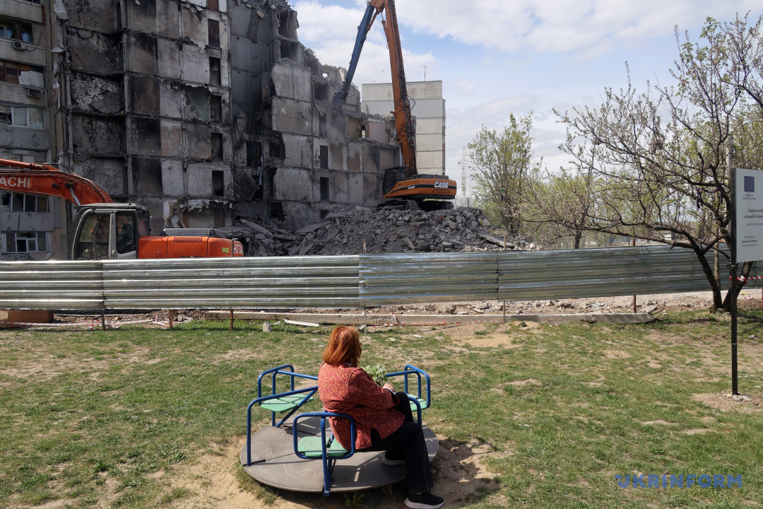 Жінка спостерігає за демонтажем понівеченої внаслідок обстрілів російськими військами житлової багатоповерхівки, Харків, 13 квітня 2024 року.