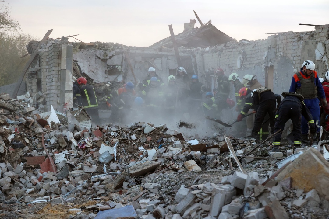 Рятувальники під час розбирання завалів після російського ракетного удару по магазину-кафе у селі Гроза, коли там проходив поминальний обід, внаслідок якого 59 осіб загинули (серед них дитина 2017 р.н.), село Гроза, Куп’янський район, Харківська область, 5 жовтня 2023 року.