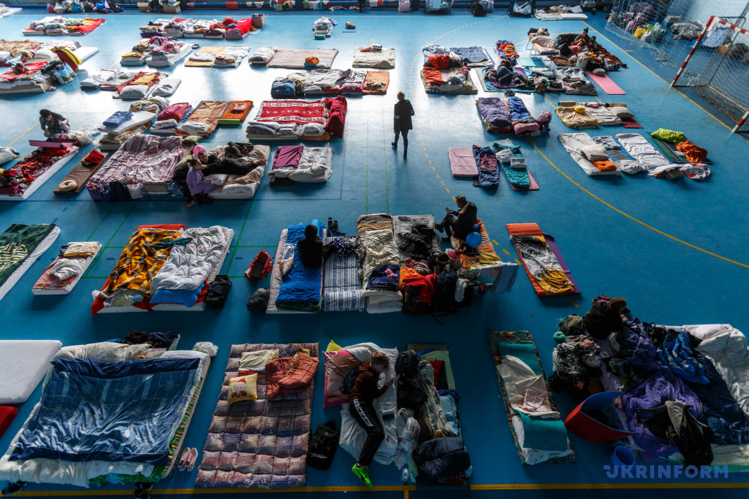 Спальні місця в одному зі спорткомплексів міста, що приймає вимушених переселенців, Ужгород, 7 березня 2022 року.