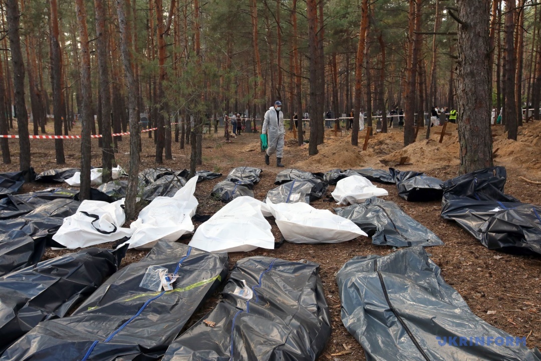 Мішки із тілами цивільних та військових, яких вбили російські загарбники, під час проведення ексгумації на місці масового поховання, що виявили після деокупації території в лісі на околиці міста поблизу місцевого кладовища, Ізюм, Харківська область, 19 вересня 2022 року.