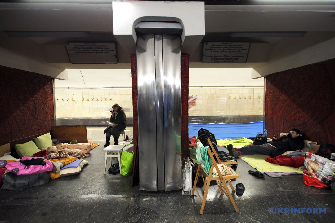 Люди біля облаштованих спальних місць на пероні станції "Палац "Україна" Київського метрополітену, який під час повітряної тривоги працює як укриття, Київ, 13 березня 2022 року.
