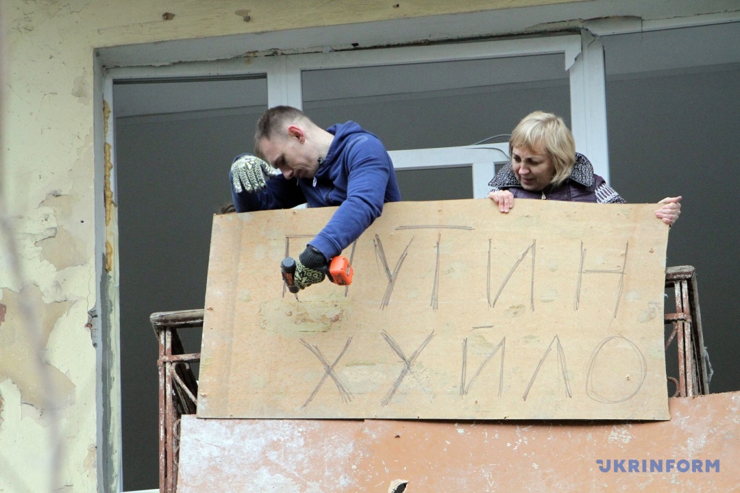 Чоловік прилаштовує лист фанери з гаслом, яке описує президента країни-агресора, до перил балкона у будинку, що постраждав внаслідок ракетного удару російських військ по Дніпру, 17 листопада 2022 року.