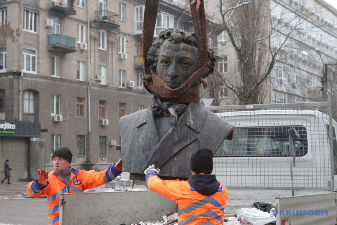 Комунальники завантажують бюст російського поета Олександра Пушкіна в кузов автомобіля під час демонтажу пам’ятника на виконання рішення виконкому Дніпровської міської ради в межах дерусифікації та декомунізації топонімів, пов’язаних із країною-терористом РФ, на проспекті Лесі Українки, Дніпро, 16 грудня 2022 року.