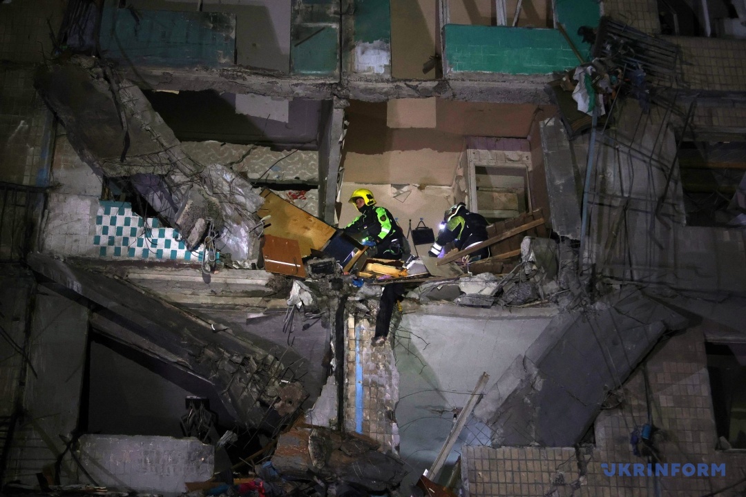 Рятувальники у понівеченому внаслідок влучання російської керованої авіабомби житловому будинку, Харків, 3 жовтня 2024 року.