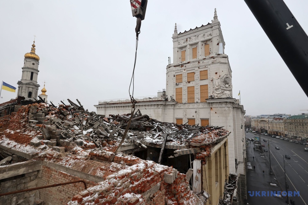 Комунальники працюють на місці російського обстрілу в центрі Харкова, розчищаючи завали на даху одного з житлових будинків, 21 лютого 2024 року.