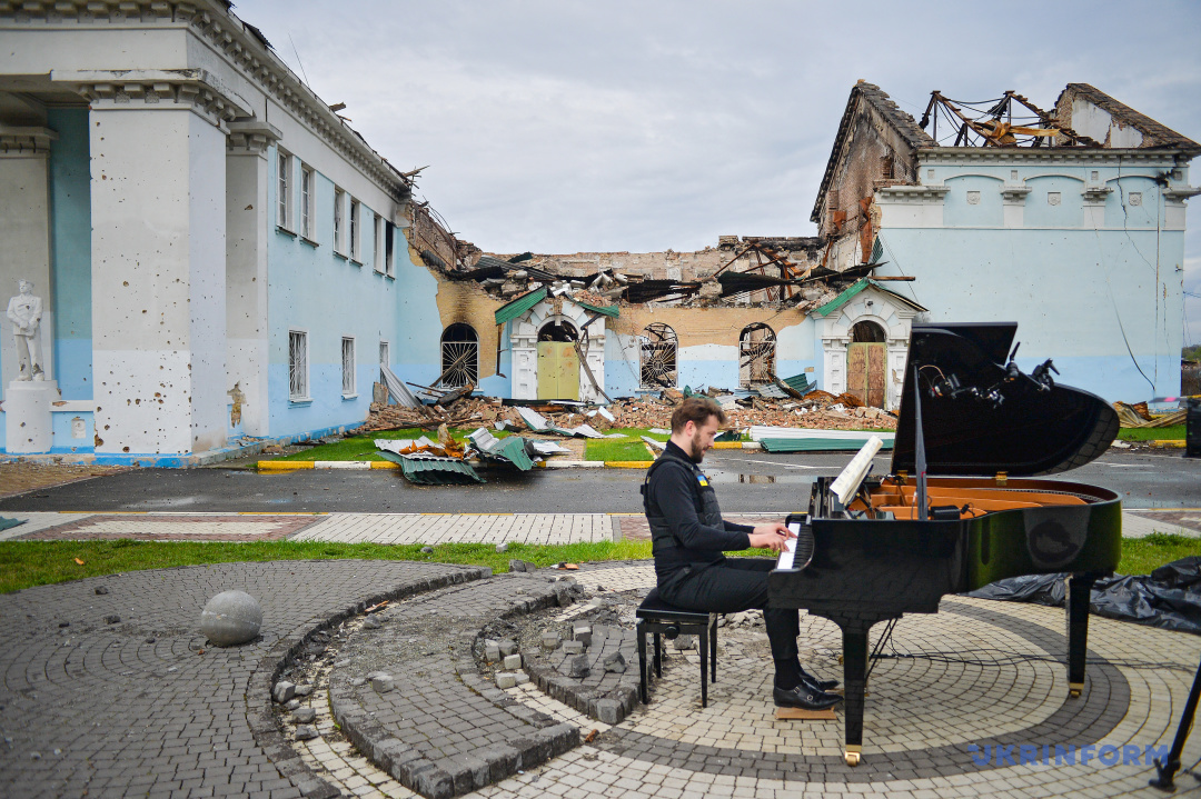 Литовський піаніст Даріус Мажинтас у бронежилеті під час виступу просто неба на підтримку України з метою поширення інформації у світі та привернення уваги до трагедії на Київщині біля Центрального будинку культури, який зруйнували російські загарбники, на уцілілій частині площі деокупованого міста, Ірпінь, Київська область, 26 квітня 2022 року.