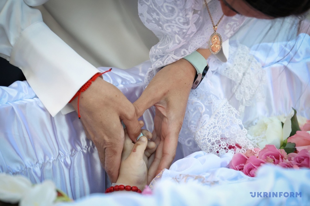 Мати загиблої 4-річної Злати Росточил Надія тримає доньку за руку під час прощання у Спасо-Преображенському соборі. Дівчинка померла 23-го травня у лікарні від травм, отриманих внаслідок російського ракетного удару балістичною ракетною "Іскандер-М" по узбережжю 29 квітня, Одеса, 26 травня 2024 року.