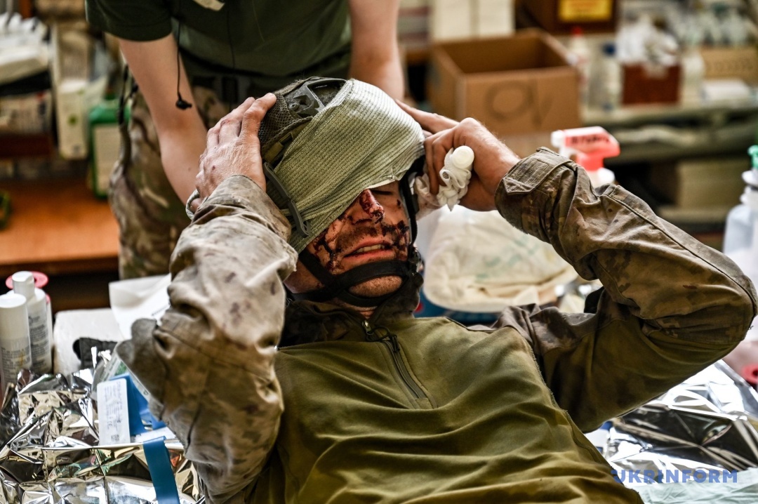 Пораненому військовому надають першу медичну допомогу у стабілізаційному пункті медичної служби однієї з бригад, що воює на запорізькому напрямку, Запорізька область, 27 липня 2023 року.