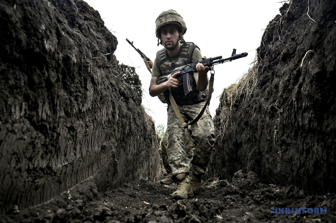 Військовослужбовець 65-ї окремої механізованої бригади ЗСУ, який проходить бойове злагодження, в окопі, 12 вересня 2024 року.