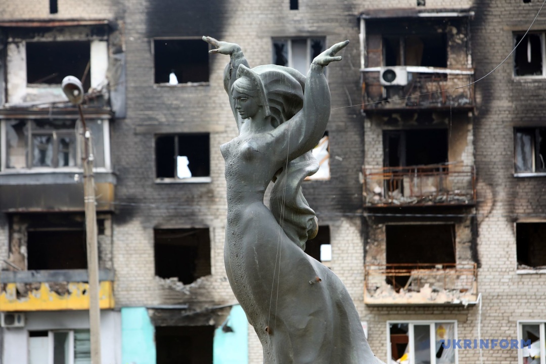 Жіноча скульптура на тлі зруйнованої внаслідок російських обстрілів багатоповерхівки у деокупованому місті, Ізюм, Харківська область, 15 вересня 2022 року.