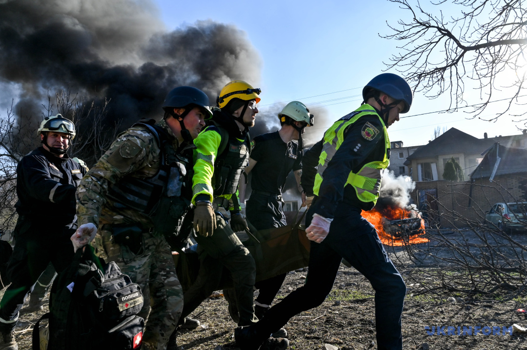 Рятувальники та правоохоронці несуть на ношах людину, яка зазнала поранення внаслідок ракетного обстрілу російськими військами міста, Запоріжжя, 5 квітня 2024 року.