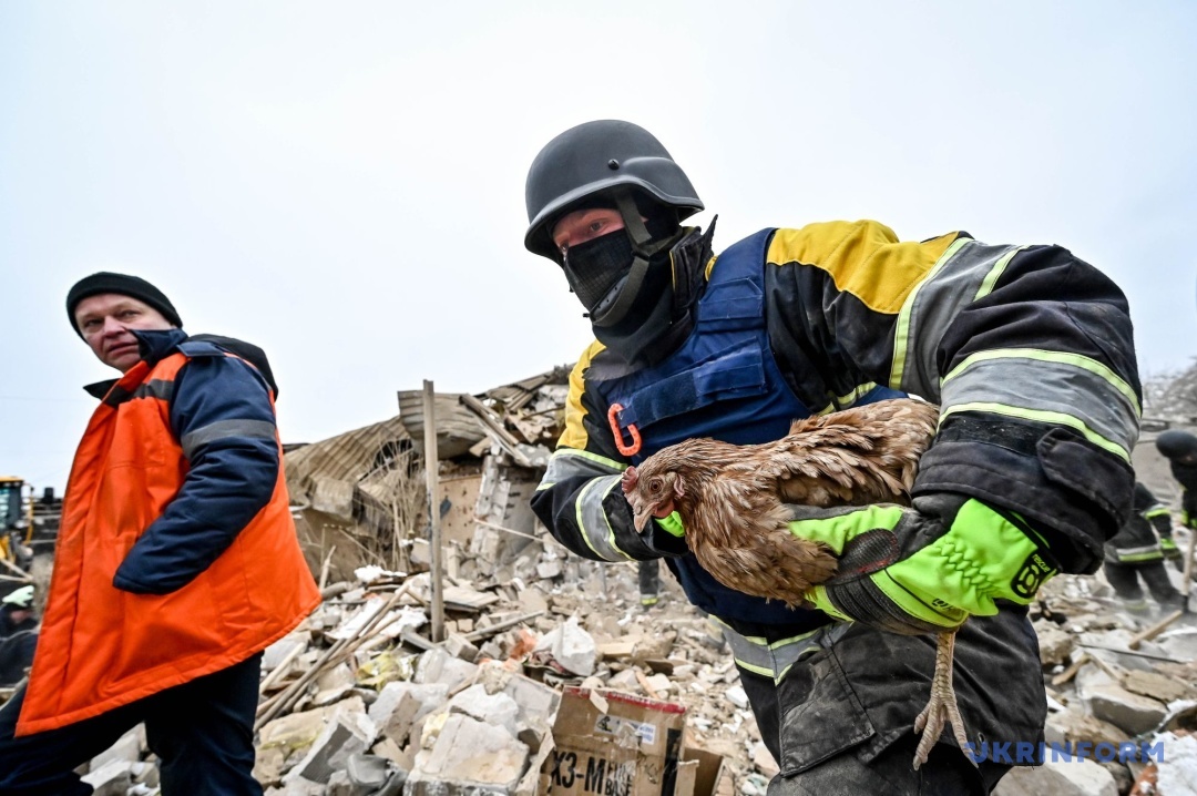 Рятувальник несе курку, яку вдалося врятувати з-під завалів одного з будинків, знищеного внаслідок масованого ракетного удару, якого російські війська завдали по Запоріжжю, 22 березня 2024 року.