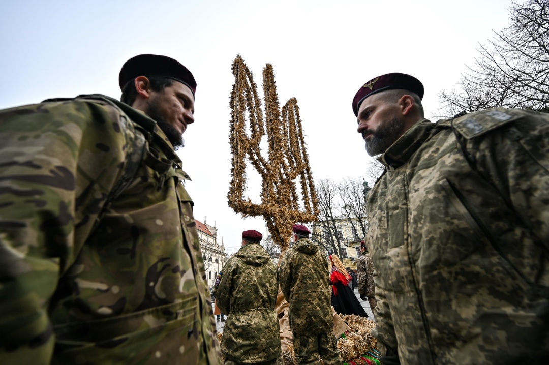 Учасники презентації військовослужбовцями 80-ї окремої десантно-штурмової Галицької бригади ЗСУ найбільшого в Україні тризуба з дідухів біля пам’ятника Тарасові Шевченку, Львів, 23 грудня 2024 року.