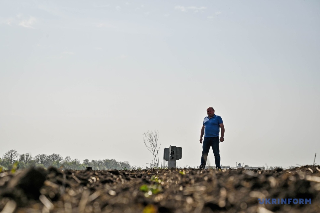 Фермер Іван Ярославович у полі біля реактивного снаряда, Запорізька область, 12 квітня 2024 року.