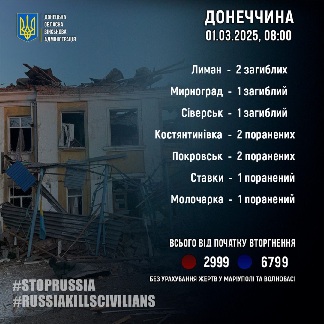 "За 28 лютого росіяни вбили 4 жителів Донеччини: 2 у Лимані, 1 у Мирнограді і 1 у Сіверську. Ще 6 людей в області за добу дістали поранення", – написав Філашкін.