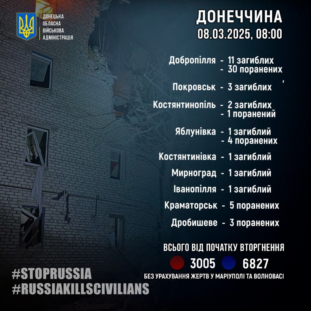 Російські загарбники минулої доби, 7 березня, вбили 20 жителів Донеччини, ще 43 завдали поранень.